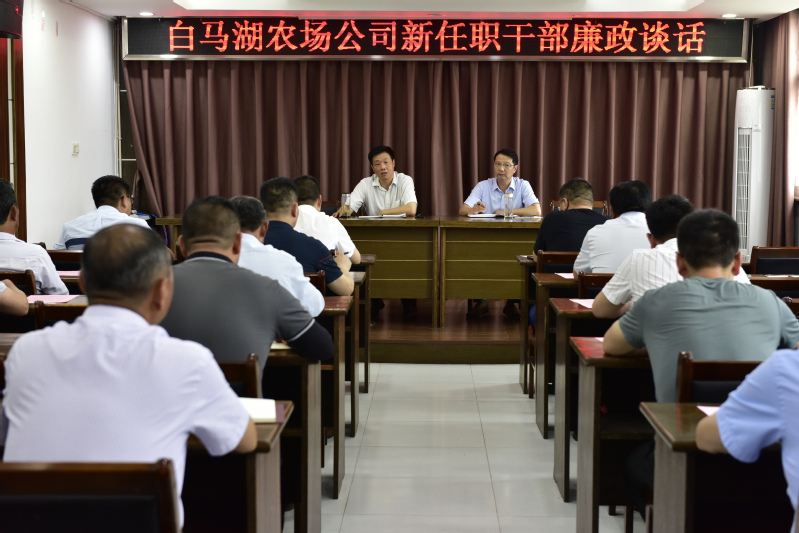 為切實(shí)落實(shí)全面從嚴(yán)治黨主體責(zé)任,提高新任職干部對黨風(fēng)廉政建設(shè)重要性的認(rèn)識,筑牢新任職干部廉潔自律的防線,72日下午,白馬湖農(nóng)場公司對40多名新提拔或崗位調(diào)整任新職干部開展集體廉政談話,黨委書記姚春華、紀(jì)委書記韓躍武分別進(jìn)行談話。